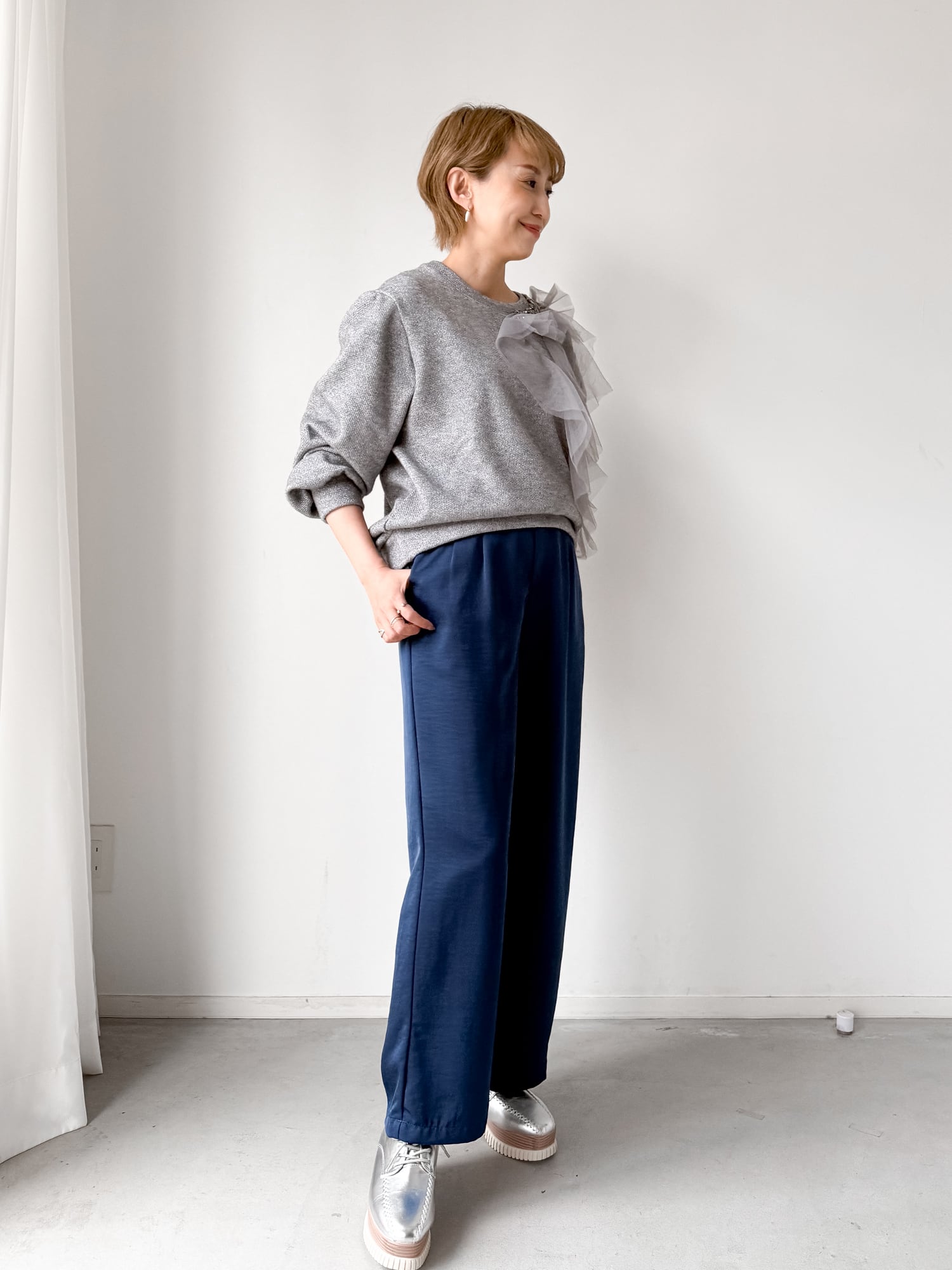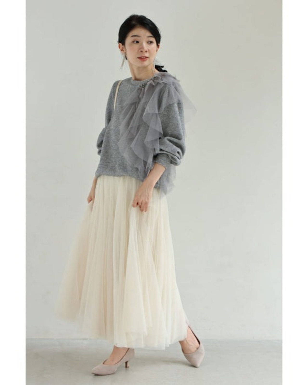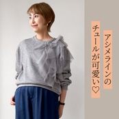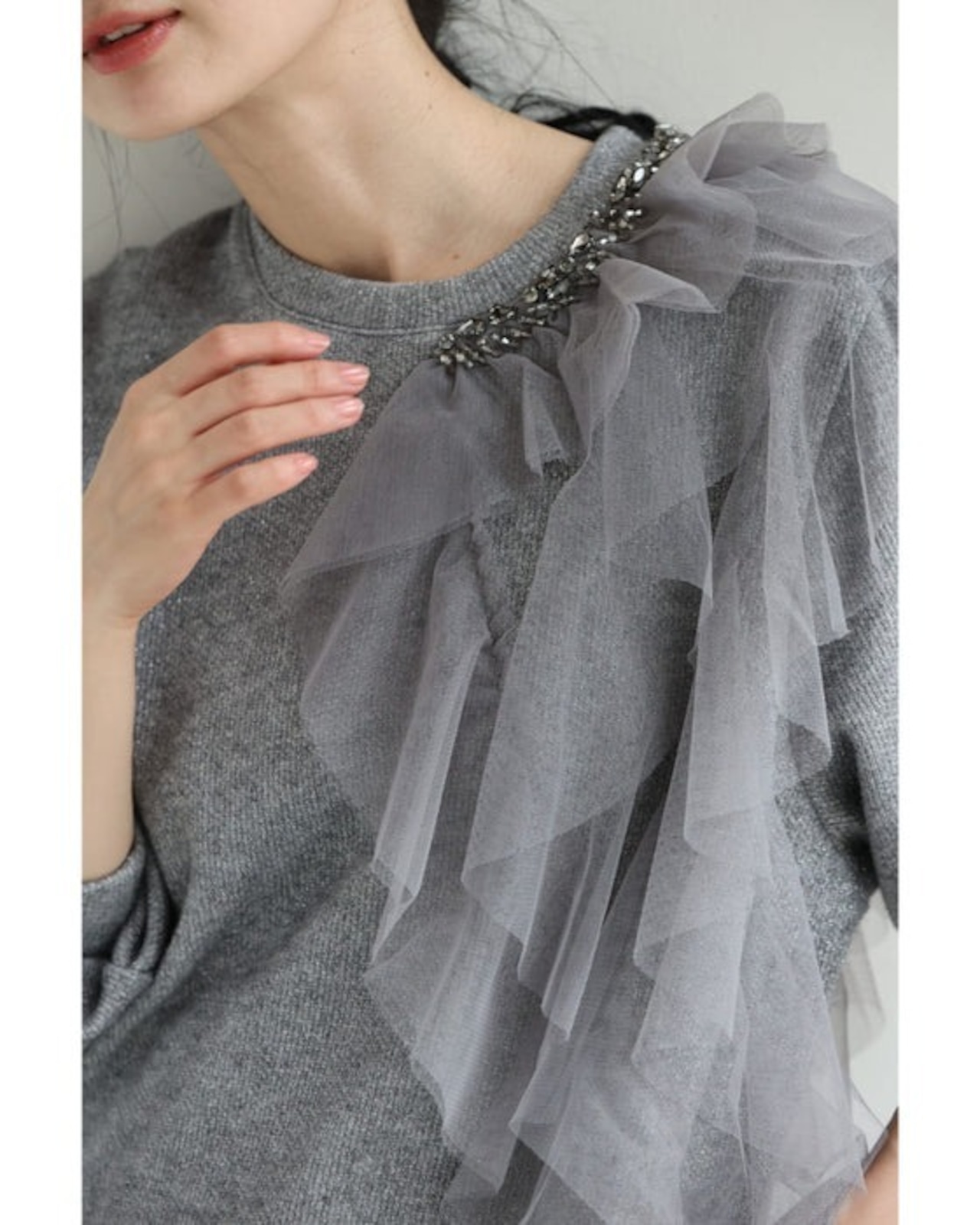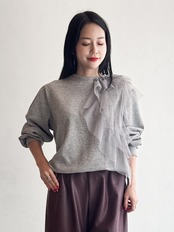 アシンメトリーなチュールを飾るラメニットプルオーバートップス